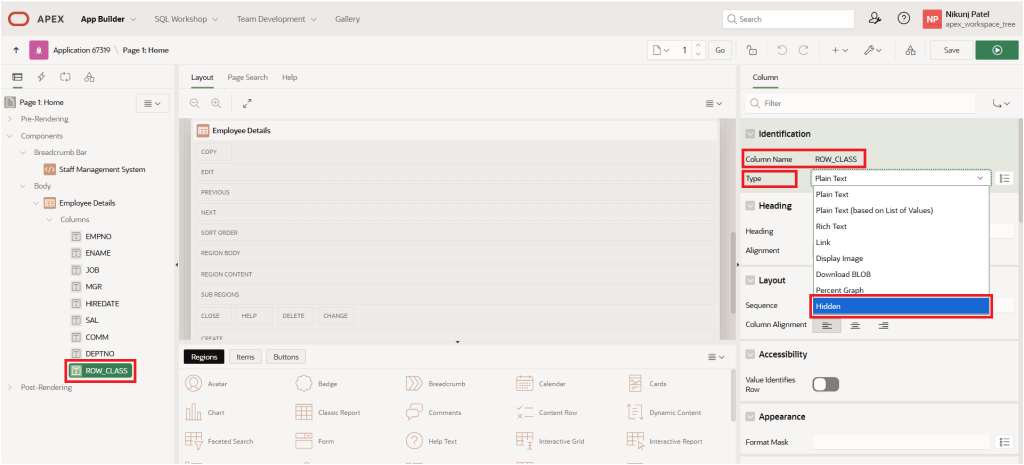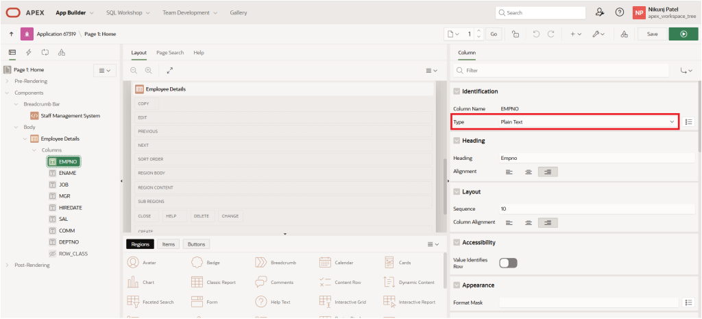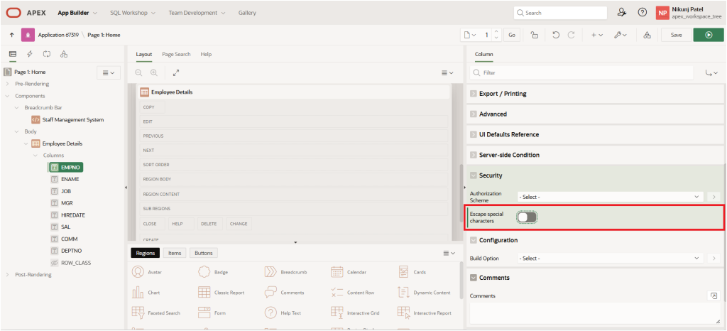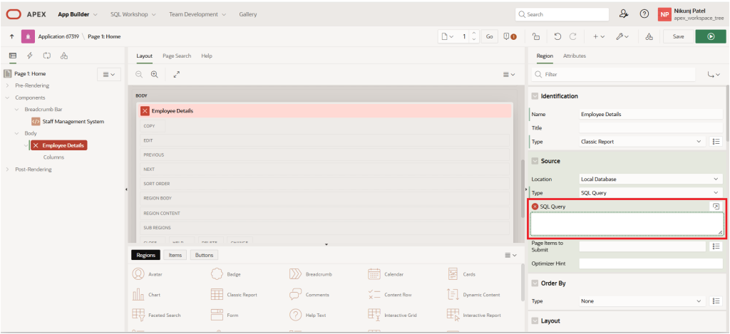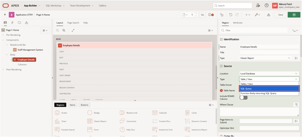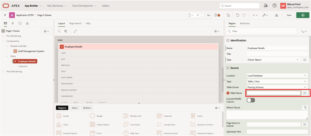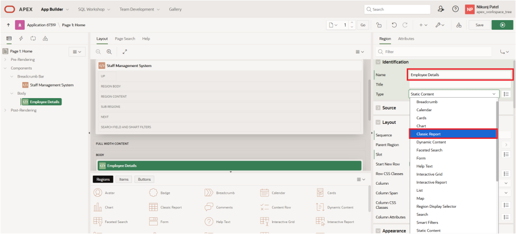 Now, change the Region Name to Employee Details and set the Region Type to Classic Report, as shown below.