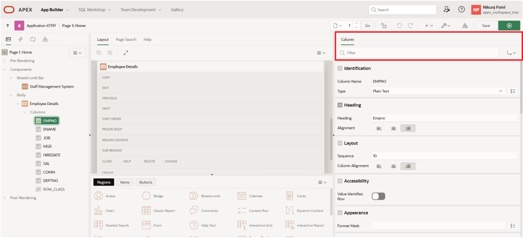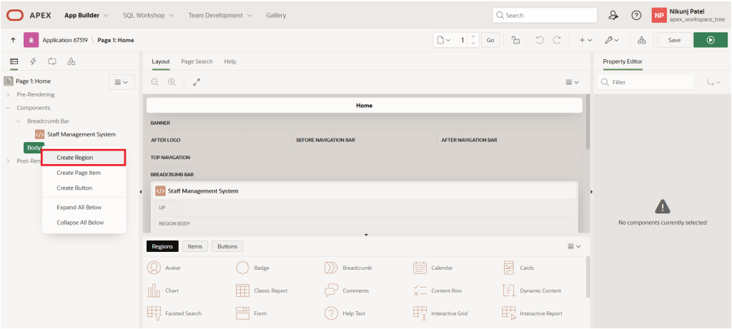 Now, on the Home page, right-click on the Body section. Oracle APEX will display a menu with multiple options. From this menu, select Create Region.