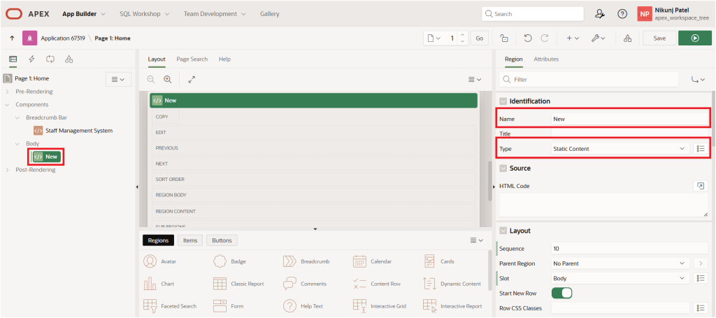 This action creates a new region on the APEX page with the Name set to New and the Type set to Static Content.